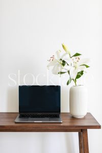 Horizontal stock photo of a desktop in neutral and pink colors.
