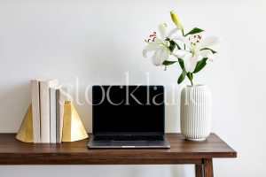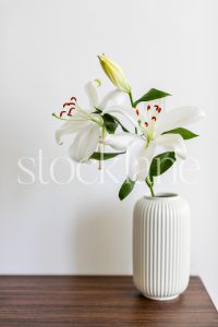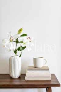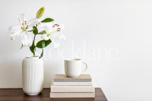 Horizontal Stock photo of Asian Lilies with books and a cup of coffee