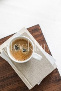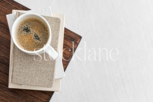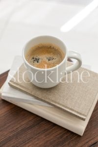 Horizontal stock photo of a coffee cup on a stack of neutral colored books.