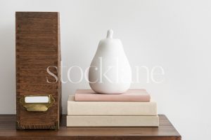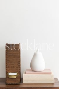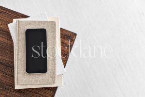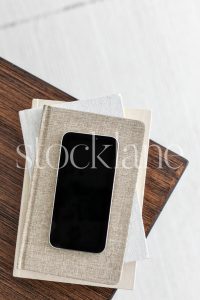 Vertical stock photo of a phone on a stack of neutral colored books.