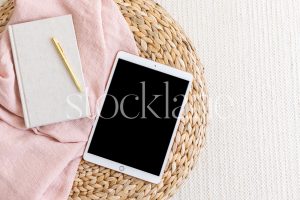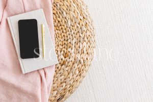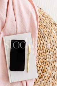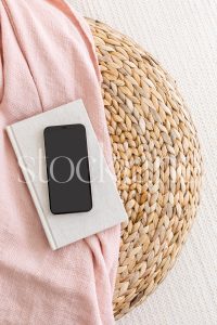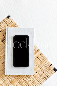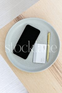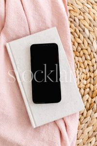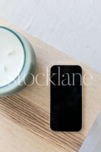 Vertical stock photo overview of a phone on a table next to a light green colored candle.