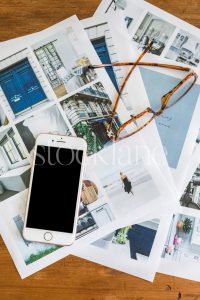 Vertical stock photo of mood board and a phone on a desk.