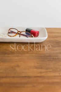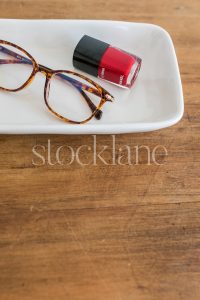 Vertical stock photo of a desk with glasses and red nail polish.