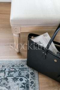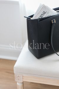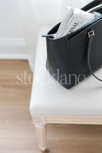 Vertical stock photo of a black handbag with a newspaper.