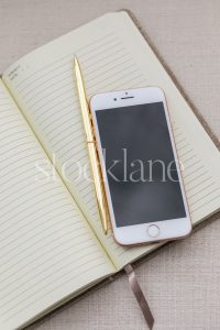 Vertical stock photo of a notebook and a phone.