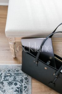 Vertical stock photo of a black handbag with a computer.