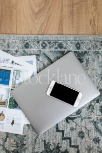 Vertical stock photo of a laptop and a phone on the floor.